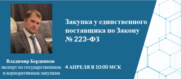 Приглашаем принять участие в бесплатном вебинаре на тему: «Закупка у единственного поставщика по Закону № 223-ФЗ», который состоится 4 апреля 2024 года, в 10:00 МСК.